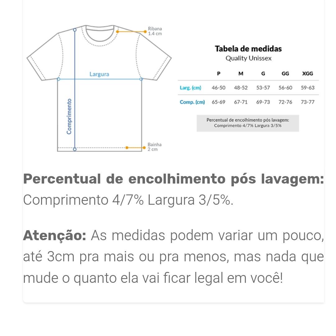 Cores do produto: Como cada tela de computador ou celular tem seu próprio jeito de mostrar cores, então a cor da sua camiseta e da estampa pode ser um pouco diferente do que você viu online.